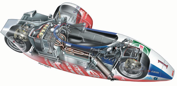 | 上記イメージ画像右側がフロント、すなわち画像右側に進行します。 前輪上部にドライバーが操作するステアリングバーを備え、その後方同軸ラインに後輪が配置、その後輪直前に2輪用1100cc4サイクルエンジンを搭載する。 エキゾーストマフラーは前輪側に向けられ配置し、その上部カウリング内部にドライバーシートがあり、ドライバーはエキゾーストを膝で跨ぐ様に着座する。 この"膝"で跨ぐ事からレーシングサイドカーは通称"ニーラー"とも呼ばれる。 サイドカーはパッセンジャーとのバランスにより車体を安定させ走行するが、そのパッセンジャーシートは画像上部に描かれている様に、本車側からオフセットされたサイドタイヤにとの後部に配置される。 パッセンジャーは1本のバーを軸に、本車側からサイドタイヤ側へとコーナーに合わせ移動し、且つコーナーの大きさにより発生する「横G」移動量を考える。 ドライバーはそのパッセンジャーの移動とバランシングを信頼してアクセルを空けタイムアップにつなげていく。 この様に、無線等コンタクト手段など持たない中で、いかにマシンを速く走らせるかはお互いが「暗黙の了解」という感性が重要な位置を占め、他のモータースポーツでは類を見ないチームワークがレーシングサイドカーの醍醐味である。 |